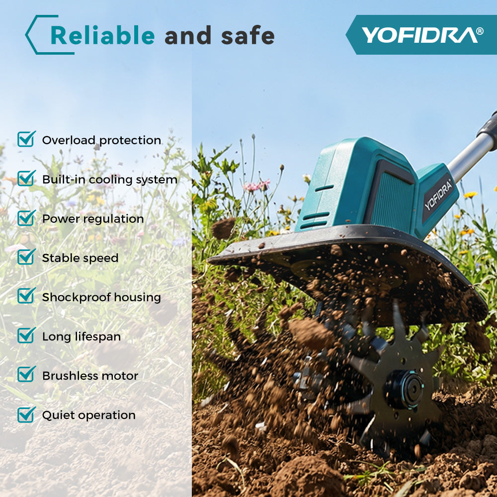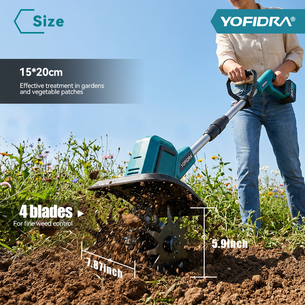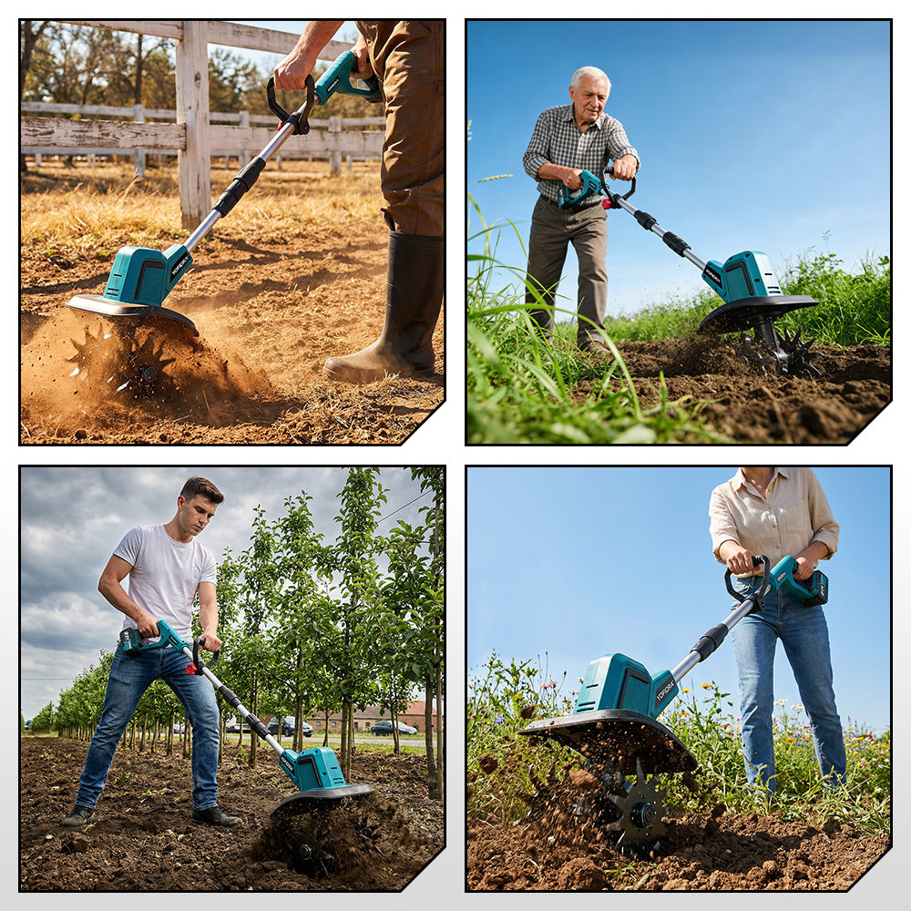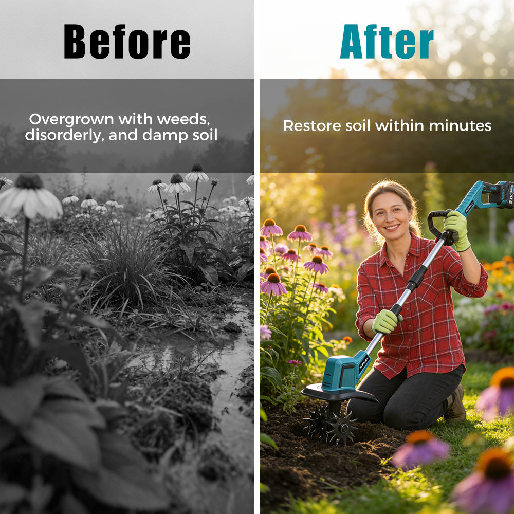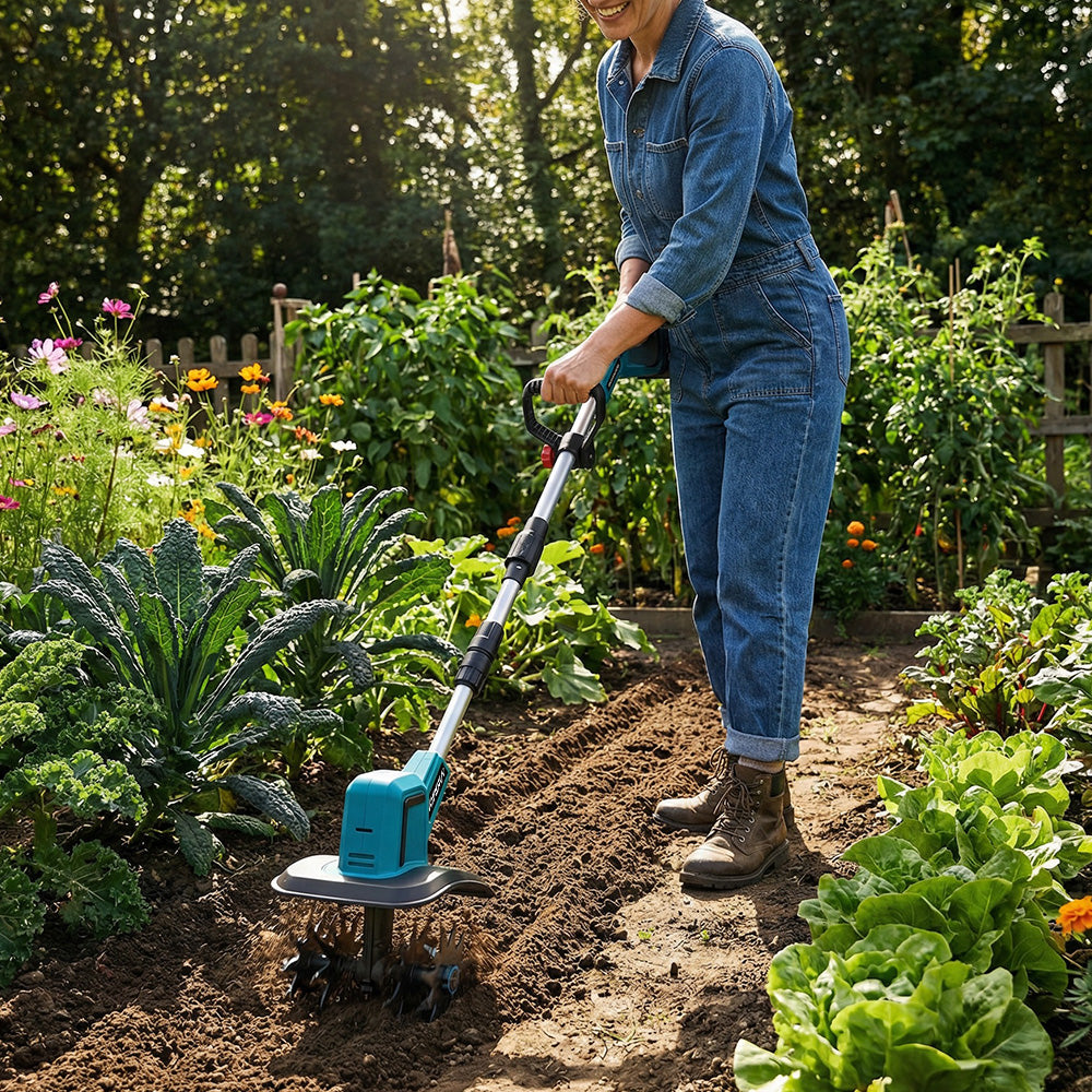 Powerful & Efficient 1500W Motor – Double-sided 4-blade cutter cultivates up to 8 inches wide and 6 inches deep, quickly preparing soil for planting or aerating lawns.