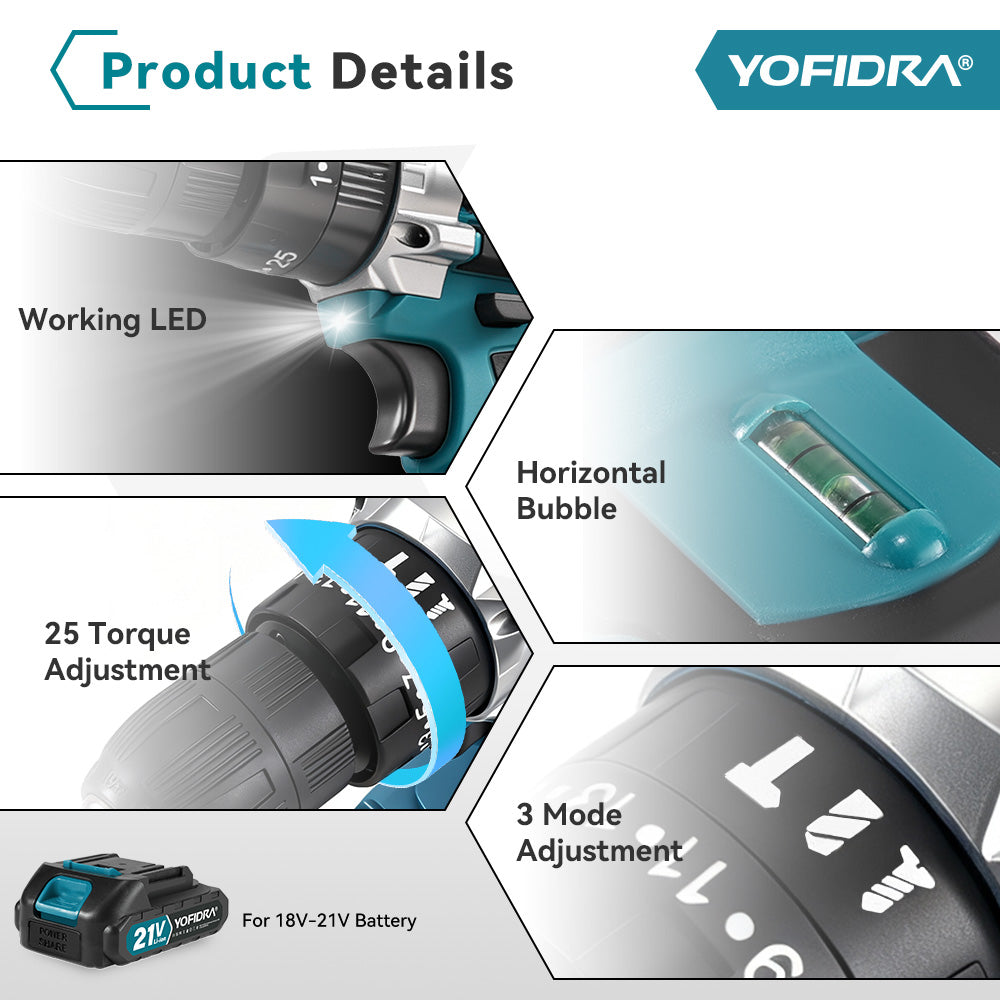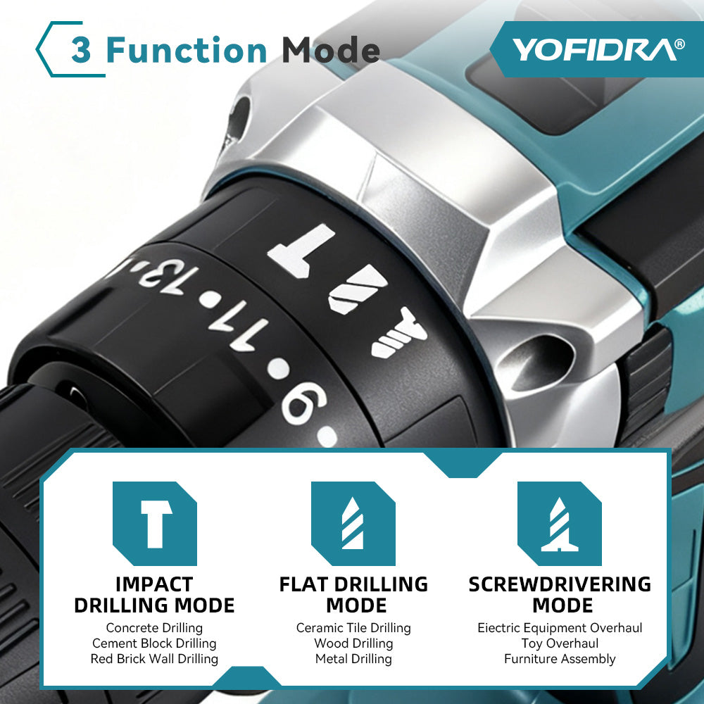 3-in-1 Versatility: Switch easily between Impact Drill, Flat Drill, and Screwdriver modes.