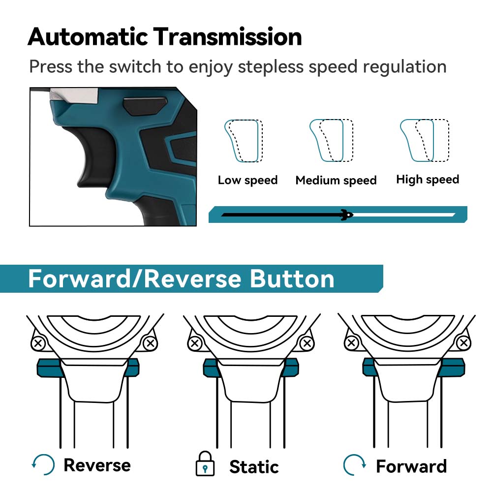 2-Speed Transmission: Low (0–450RPM) for control, High (0–1500RPM) for efficiency.