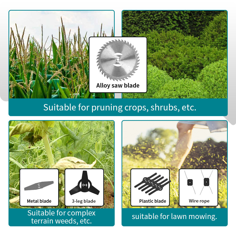 Three-in-One Blades – Plastic, metal, and alloy saw blades for lawn mowing, pruning, and trimming crops or shrubs.